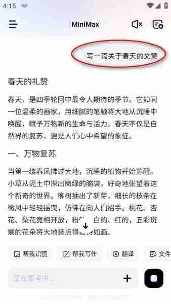 比如输入写一篇关于春天的文章,后面可以加一些要求,然后就会开始(start)生成;