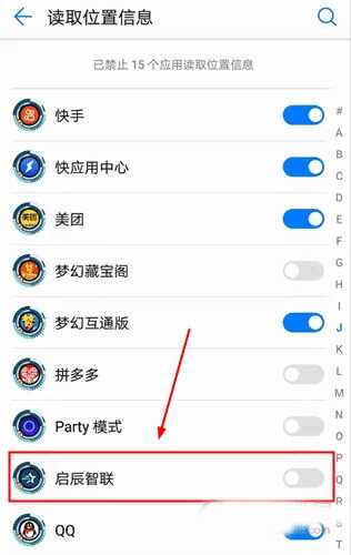 2、然后在权限管理功能界面下选择”读取位置信息(xinxi)“的功能,在该界面下找到启辰智联应用,将权限关闭即可关闭软件的定位了。