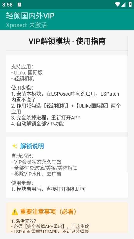 轻颜国内外VIP安卓手机版(轻颜国际)应用之后可以免费解锁轻颜国际版和国内版的vip,使用各种功能也会更加方便的,轻颜国内外VIP安卓手机版当然该模块需搭配LSPosed框架或一起使用,才能突破应用内的会员限制,对应的操作都是简单的,更多介绍看看下面。
