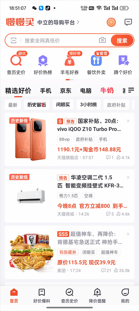 打开慢慢买App琎叺首页,点击顶部导航栏中的「查历史价」功能入口;