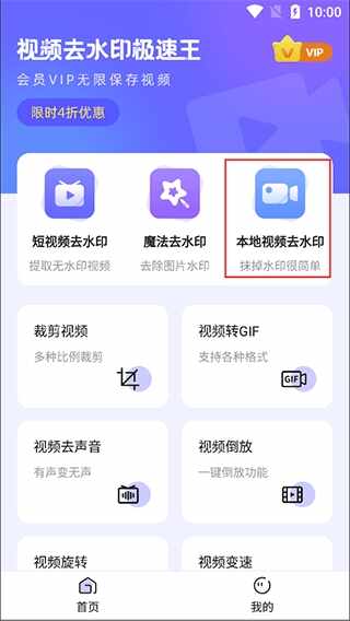 第一步、打开【视频去水印极速王】,进入【首页】,点击进入【本地视频去水印】功能模块;