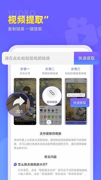 打开APP首页,点击【短视频去水印】,把对应平台的视频链接贴入输入框内点击【快速提取】,然后点击【保存到本地】保存。