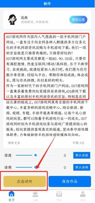 1、打(da)开首页输入你想(xiang)要(yao)转变成语音的文字文本,点击试听。