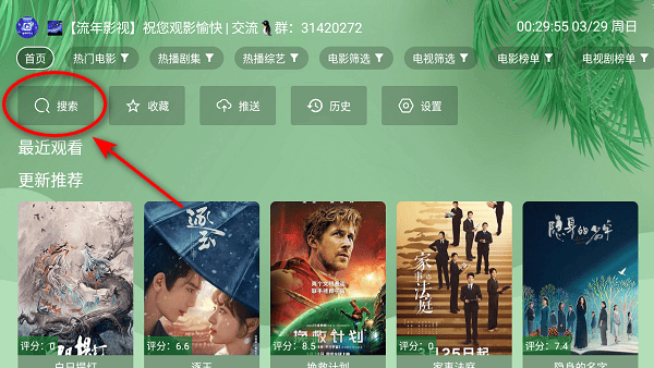 1、打开流年影视TV版后,在“首页”点击“搜索”按钮;