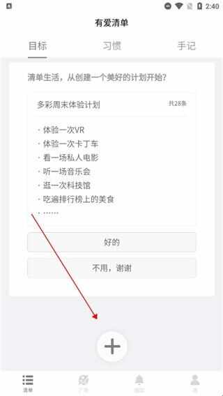 有爱清单(有爱清单销号怎么处理)养成习惯的软件。这款软件功能简单,支持选定目标、记录实现历程、打卡好习惯、写手记等功能,有爱平台用户使用这款软件可以任意记录目标/愿望/梦想,并向其前进。界面设计清新耐看,操作简单,这里还有更多内容可以看看下面的介绍。