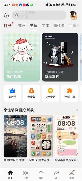 1、打开OPPO主题商店App后,首页将展示热(re)门(men)主题推荐与各类功能,方便你快速找到自己喜欢的主题和壁纸。