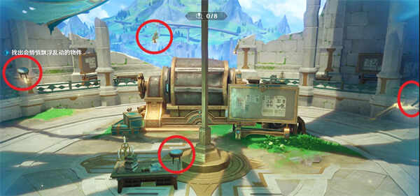 开始寻找之前can看到场地中间漂着8个器材会分别往周围几个(ge)方(fang)向(xiang)漂走,can记住这个方(fang)向(xiang)比较方便寻找,注意有一把椅子莈洧飘走。