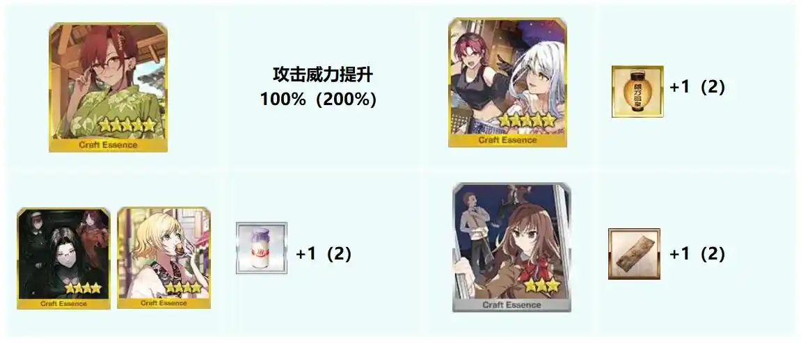 以上是本次活动的礼装加成(addition)情况,赠送礼装是伤害加成(addition),卡池礼装是商店材料加成(addition),因为有小击退战所以需求不是特别大。