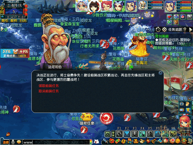 “深海决战”的PVE任务共有两种,第一种为“前哨任务”。该模式主要为环式任务,覆海帮阵营的小伙伴可以找泾河河伯(江海阵线437,87)领取前哨任务,四海龙宫阵营的小伙伴则需要在鲤元帅(江海阵线地图139,235)出领取任务,完成之后可以获得经验、金钱、战勋等奖励。需要注意的是,该模式会正常消耗(consume)装备耐久、法宝灵气。