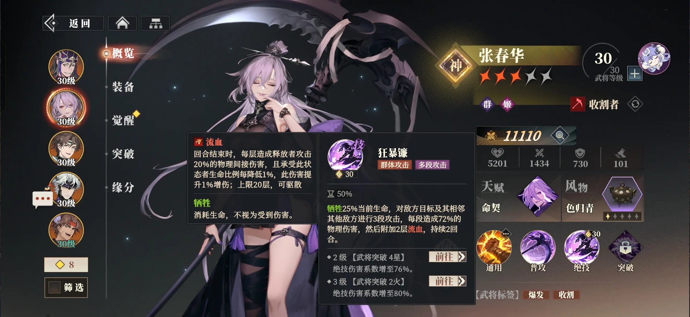 4、技能释放顺序:在战斗开场,如果有蹇硕拉条,张春华能够直接释放绝技,打出先手高额伤害与流血效果。后续回合中,根據敌方角色(juese)状态,优先对敌方增益较多的角色(juese)运用驱散技能,再对血量较高的角色(juese)运用破甲技能,最(zui)后(hou)运用绝技进行(do)爆发输出。如果敌方有残血角色(juese),优先击杀,触发曼珠沙华的回复战意效果,加快绝技循环。