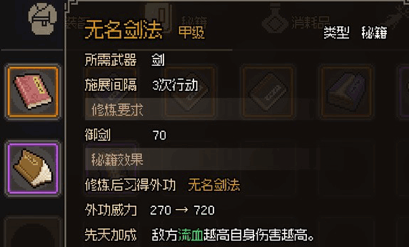 1、接下来介绍第二本武学,这武学没有名字,因为它并不是根据书的名称命名的,想要(xiangyao)拥有这门武学,是要满足(satisfy)特定条件的。