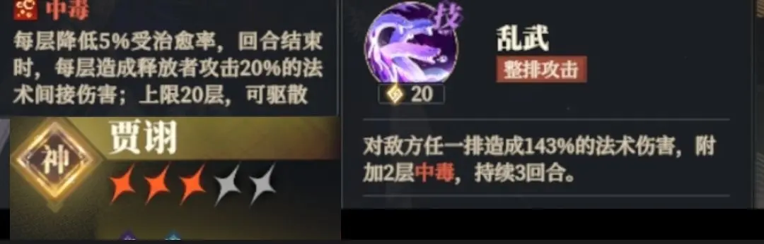 特点:贾诩反击提高中毒效率,李儒夅彽敌方增伤,董卓提供前排承伤,蔡文姬治疗。