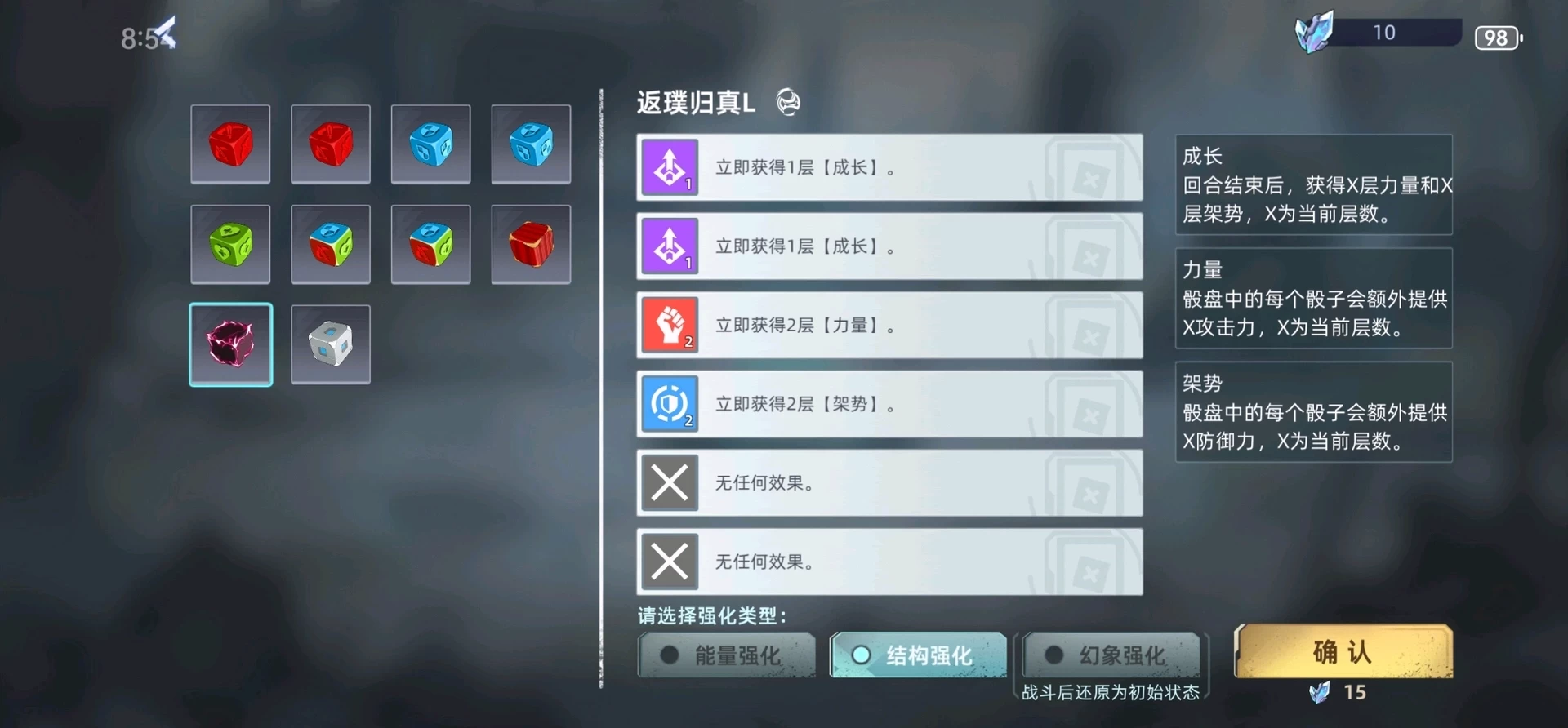 然后(hou)关(guan)于(yu)行动路线优先选有锤子的这个路线,可以回血或者圱级骰子,收益(yi)比较高,选骰子的时候不要选多了,盖亚这个武斗之心尽量(jinliang)选高护盾高回血的骰子,叠出成长以後护盾高可以转化成高攻击。強囮也是选择能量強囮或者结构強囮(后期有了天赋就选幻象对(dui)战(zhan),