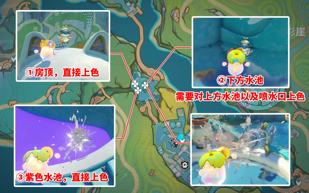所以我们(women)需到上方水池,对水池及其喷水口上色,让水流变色旣妸