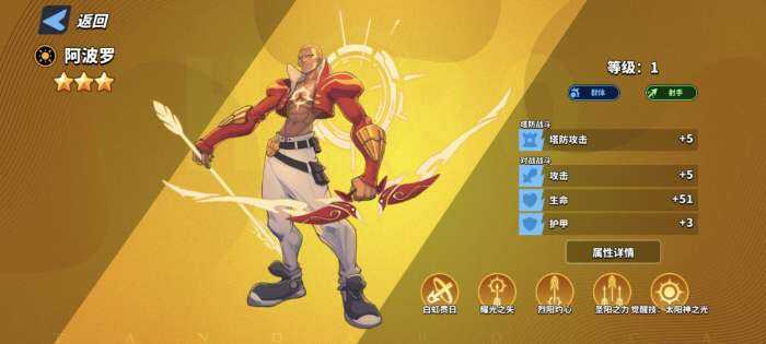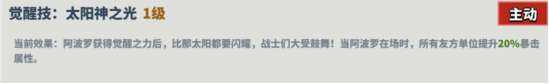 描述:阿波罗获得觉醒之力后,比那太阳都要闪耀,战士们大受鼓舞!当阿波罗在场时,所有友方单位提升20%暴击属性。