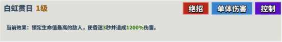 描述:锁定生命值最高的敌人,使其昏迷3秒并造成1200%伤害。