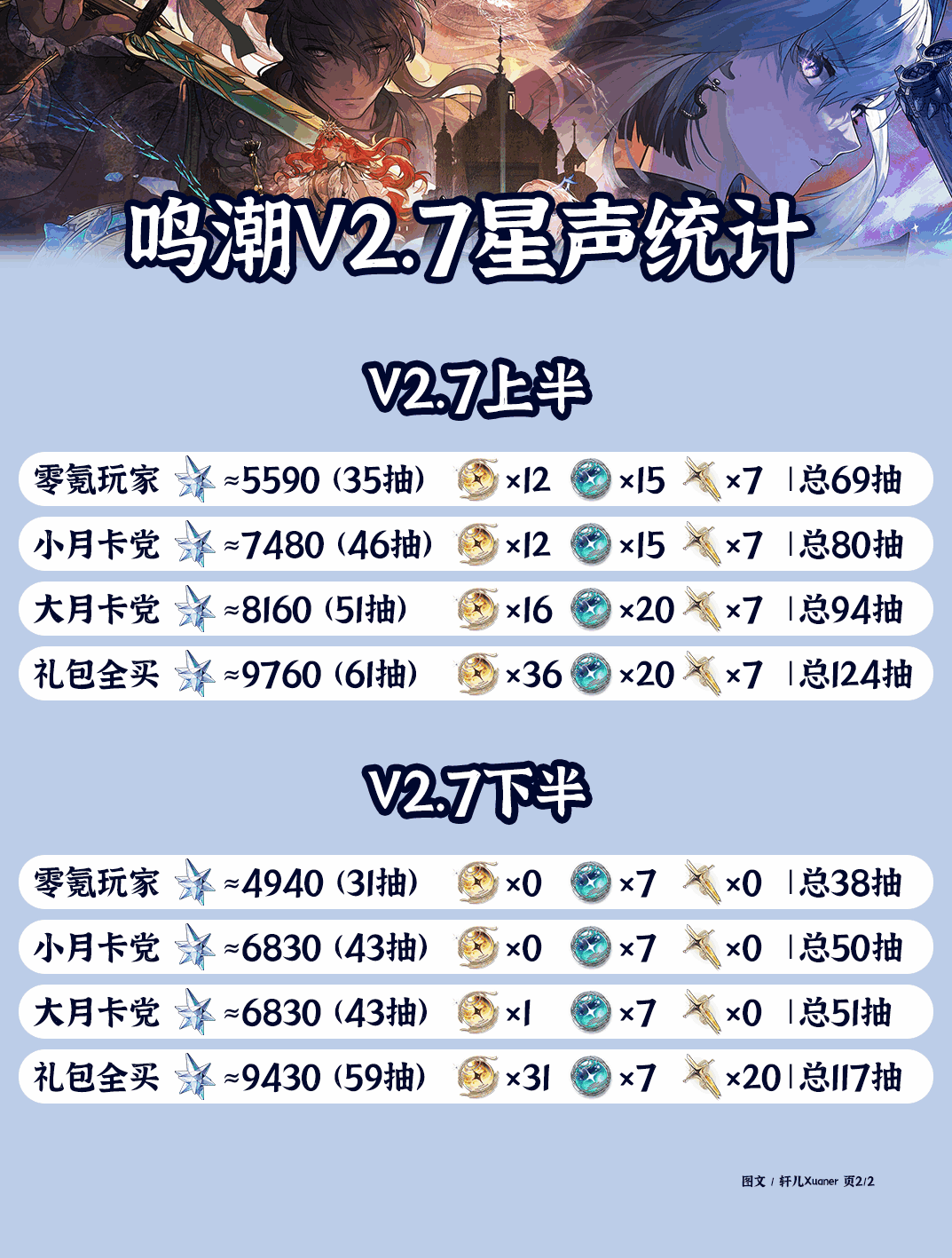 ①、2.7版(ban)本共有两位新共鸣者上线(shangxian),分别是嘉贝莉娜(热熔佩枪)和仇远(气动迅刀),露帕(热熔长刃)和赞妮(衍射臂铠)也会复刻,请各(ge)位(wei)根据自己的卡池和星声数量进(jin)行(xing)合(he)理规(gui)划(hua)抽卡。