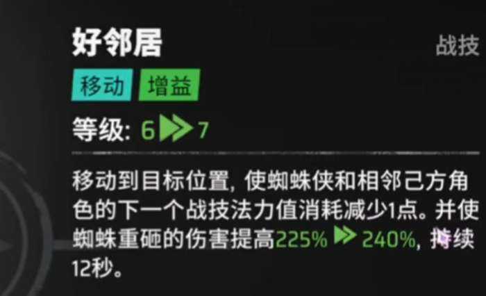 这是一个兼具位移与增益的多功能技能。用起来后蜘蛛人可快速移动至指定位置,并为自身及周圍队友提供下回合战技法力消耗降低的效果,同时提升“蜘蛛重砸”的伤害数值。该增益状态可持续12秒,且在技能再次释放时效果可刷新。这一技能增强了蜘蛛人的战场机动性和团队协作能力,在关键时刻可帮助队伍节省资源并提升控制衔接的稳定性。