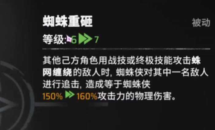 蜘蛛人在(renzai)漫威秘法狂潮中的核心天赋是“蜘蛛重砸”,该能力可在队友释放战技时触发,将负面效果施加于敌人(enemy),并对被蛛网缠绕的目标进行一次追击。这次追击造成高达180%攻击力的物理伤害,同时为蜘蛛人积攒30点终极能(neng)量,加快(accelerate)大招释放节奏。这一机制使得蜘蛛人在(renzai)配合具(ju)有(you)频繁战技输出的队友时表现尤为突出,能(neng)量获取(Obtain)更加稳定,战斗(fighting)节奏更流畅。