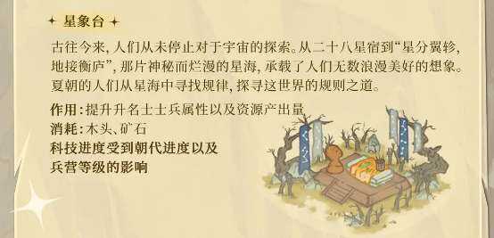 星象台能提升(tisheng)士兵以及名士的属性和资源产出量,不过科技进度会受到朝代进度和兵营等级影响。