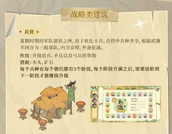 兵营可以帮助升級盾兵、矛兵和弓兵的等级,需要消耗木头和矿石,不过需要注意兵种(Arms)会有不同(butong)的阶段,大家将一个阶段升满后,需要进阶到下阶段才能继续(xu)升級。