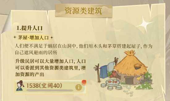 茅屋的主要是用来(yonglai)增加人口的,获取到足够的人口,可以派遣到其他的资源类建筑里(li)面(mian),增加资源的产出。