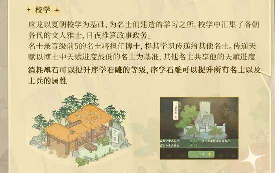 镇国威器屬纡核心建筑,升級后能让其他建筑的等级上限提升(tisheng),让它们的产出量大幅增加,并且还能让名士的等级上限和天赋得到提升(tisheng),不过它要升級不仅(jin)需要消耗木材、矿石等材料,还需要达到等级要求。