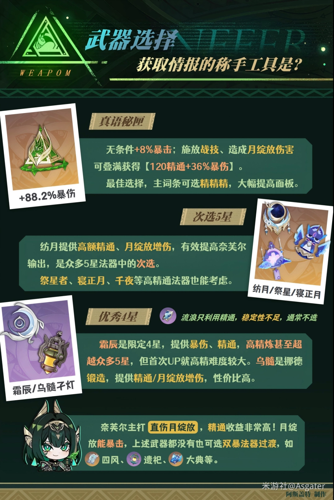 ②【流浪乐章】不作推荐,奈芙尔主打直伤月绽放,而攻击、元素增伤不能提高月绽放伤害,只能依靠1/3漑卛的精通提升,而且持续10秒、冷却20秒导致真空期较大,表现一般。