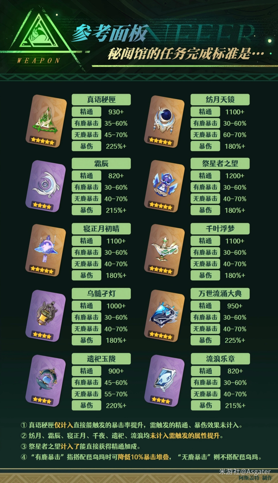 ① 高精炼【霜辰】表现极佳,尤其是精5能跃升至第2、3位,副属性给暴伤、重击/战技命中都能获(huo)得(de)精通增益,完全满足奈芙尔的属性需求,唯一缺点便是限定4星、首次登场就抽至高精炼难(nan)度(du)不低。