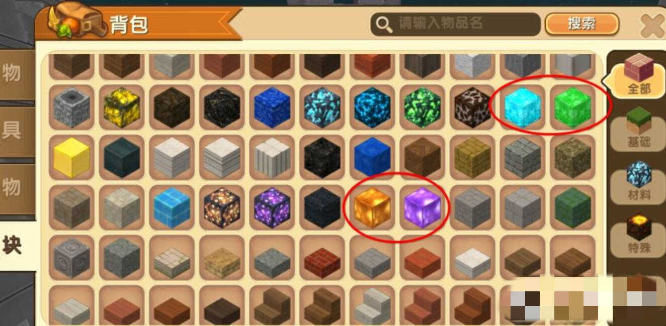 2、准备好(get ready)星铜石块、蓝钻石块、紫莹石块、孔雀石块。其中(qizhong)孔雀石和蓝钻石地球上就(jiu)有(you),另外两种在萌眼星找,创造模式可直接拿。