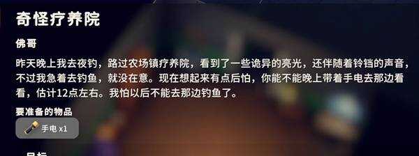 带(dai)着手电筒(护甲商橘子处购(gou)买(mai),需橘子任务解锁),到疗养院正门互(hu)动(dong),时间(jian)在晚上23:30-24:00之间(zhijian)。
