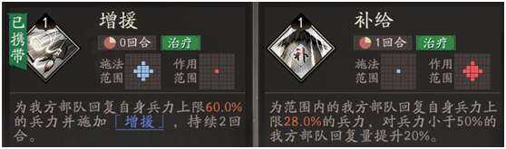 基础治疗技能增援和补给,前者由于没(mei)有(you)CD且能百分比回血,因(yin)此(ci)可以一直携带,增援可以使我方部队受到伤害时回复20%血,相当于该技能可以每回合为友军回复80%血,非常强力,而补给则没(mei)有(you)什么携带必要,奶量太低了