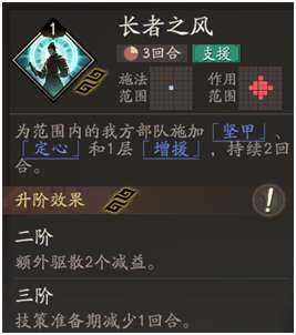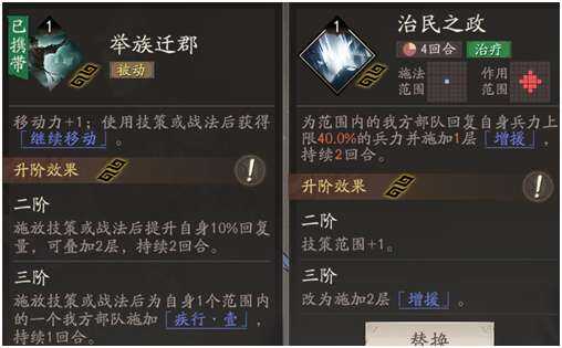 核心技能举族迁郡和治民之政,前者可以使李典移(yi)动(dong)力+1且释放技能战法后可以继续(jixu)移(yi)动(dong),完美适配天赋调整位置触发回血,升(sheng)级后还可以在释放技能后给自己叠加回复能力,还能为一格范围内一个友方部队施加疾行一(移(yi)动(dong)力+1),而治民之政则是个范围百分比回血技能,同时能施加增援效果(guo)持续2回合,升(sheng)级后可以使技能范围+1并且额外施加一层增援,群回能力非常强