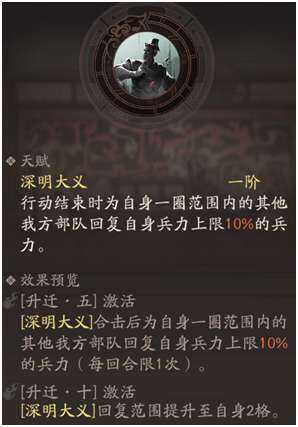 天赋深明大义,行(xing)动结束即可为自(zi)身(shen)周围一圈范围其他部队回血,5星后可以在合击后同样进行一次范围回响,每回合限一次,满星后可以使回复范围提升至自(zi)身(shen)2格,由于初始一圈范围有点小,且限制了己方走位,因(yin)此(ci)还是满星后用着更舒服