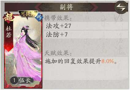 副将推荐:奶妈专属杜夫人没什么好说的,另一个则随便带个能提供些治疗量或者肉度的就行,如果没(mei)有(you)杜夫人也是一样,甚至由于李典技能都是百分比治疗,因(yin)此(ci)只需要副将提供些肉度就行,不需要额外的(additional)治疗效果(guo)