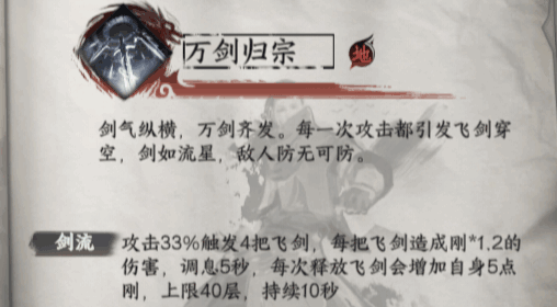 攻击(gongji)33%触(chu)发(fa)4把飞剑,每把飞剑造(zao)成刚*1.2的傷嗐,调息5秒,每(mei)次(ci)释(shi)放飞剑会增(zeng)加自身(zishen)5点刚,上限40层,持(chi)续(xu)10秒
