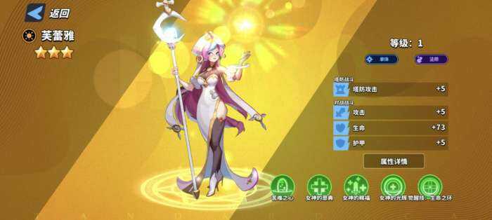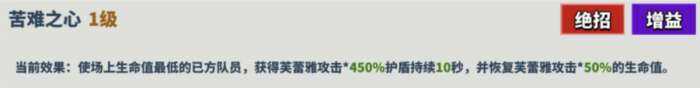 描述:使场上生命值最低的己方队员,获得芙蕾雅攻击*450%护盾持续10秒,并恢复芙蕾雅攻击*50%的生命值。
