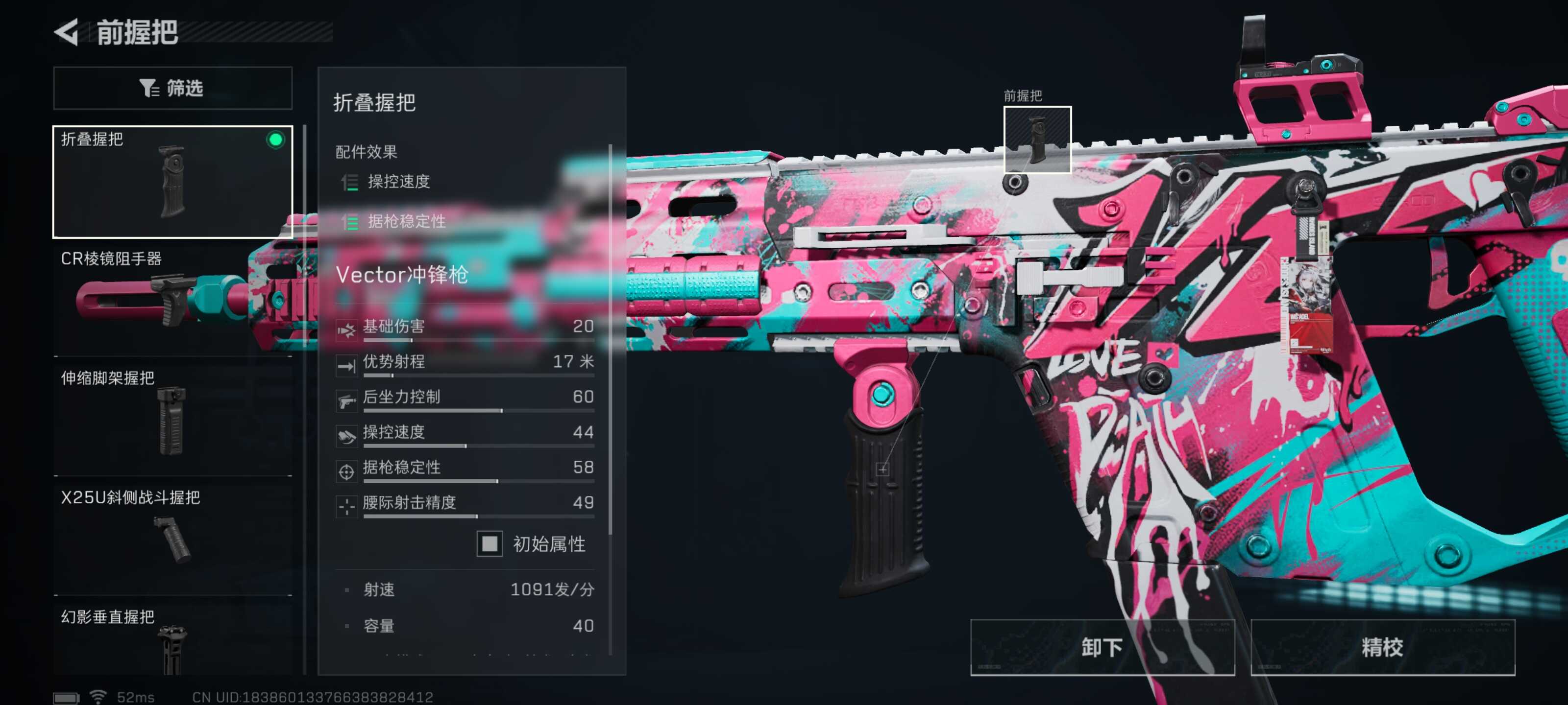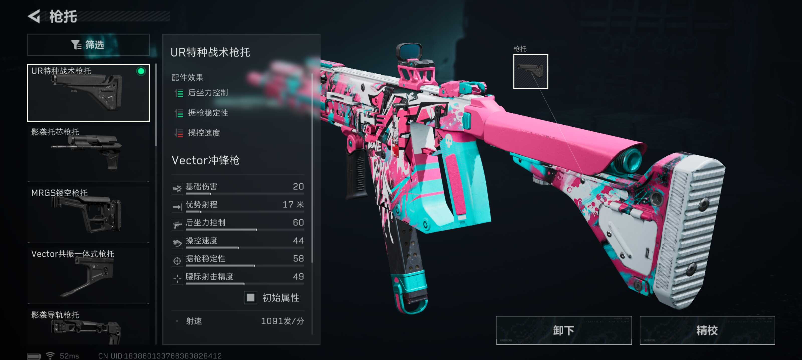 枪托选择UR特种战术枪托。虽然这个枪托减少一定的操控速度,但是(danshi)可以使枪械的后坐力控制以及据枪稳定性更加(more)稳定。下面是枪械精校: