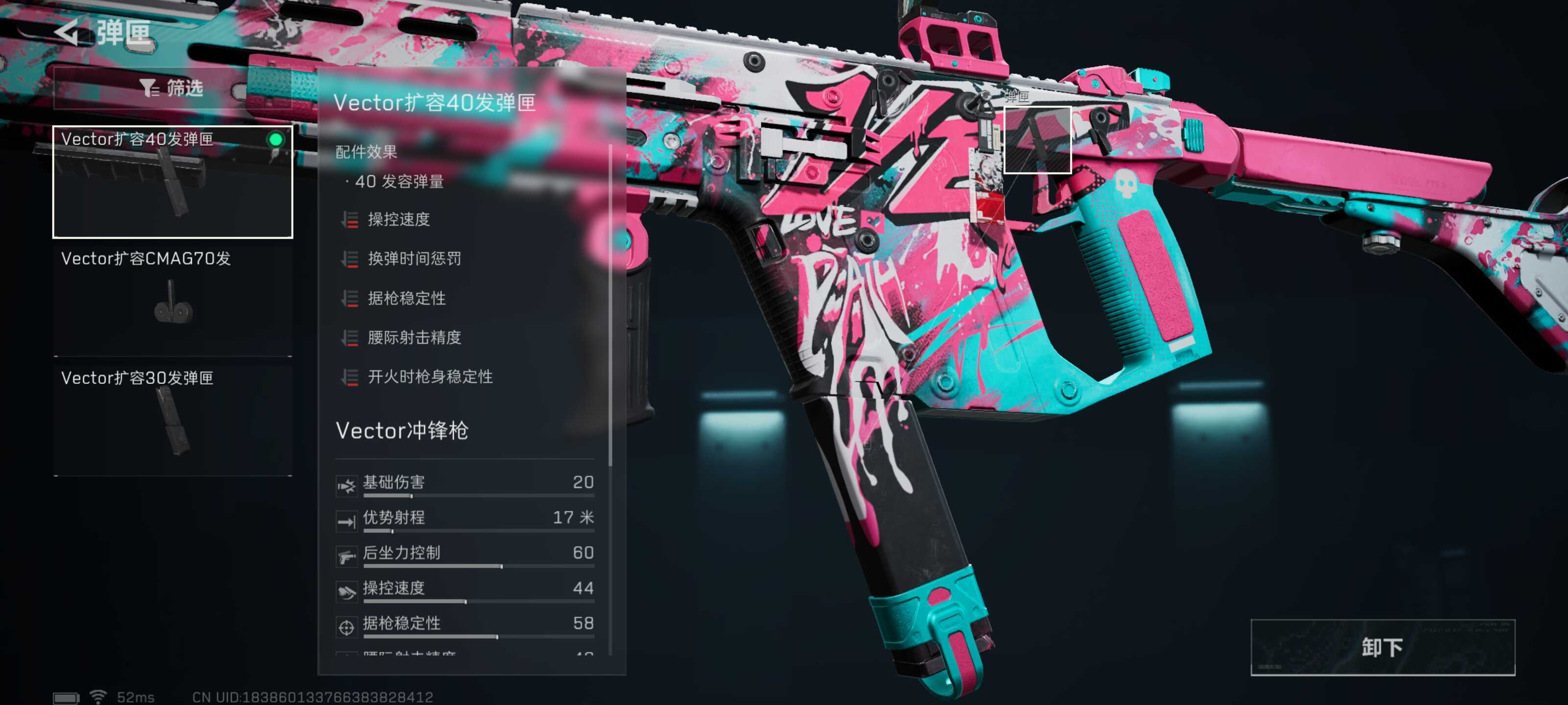 弹匣选择Vector扩容40发弹匣。对比Vector扩容CMAG70发这个配件(Accessories)带来的大额的负面负面属性(Attributes),以及Vector扩容30发弹匣这个配件(Accessories)的续航能力差,选择这个弹匣带来的负面属性(Attributes)更小是非常匼适的。