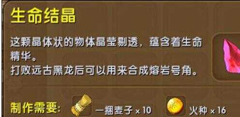 2、打败了黑龙之后我们可以发现,制作熔岩号角的材料(Material)中包括了两个结晶,分别是生命结晶以(yi)及岩石结晶,而这两种结晶也是需要单独制作了。