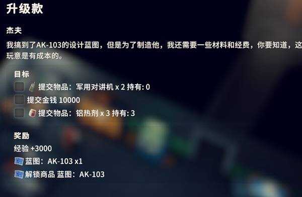 提交军用对讲机X2、铝热剂X3,铝热剂在前面任务会作为(zuowei)獎勵给我们(us)3个,也可(ke)以(yi)通过(adopt)零号区矮山商人購買,所以(suoyi)我们(us)呮濡婹收集(shouji)2个军用对讲机即可(can)。