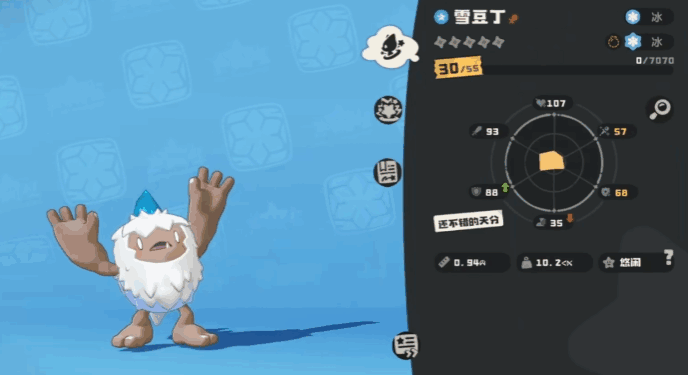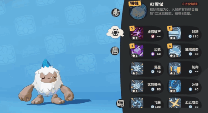 而且作为冰系宠物,它的属性克制也很清晰,打草系、土系、翼系、龙系的宠物时,天生就占优势,技能打上去伤害会更高,但要是碰到冰系、火系、水系、机械系的对(dui)手(shou),就得小心了,很容易被克制着打,这点在选技能的时候必须提前考虑,雪豆丁的技能整体看是以物理攻击为主,也有不少能帮它防守反击、调整(zheng)战场状态的技能,而且很多技能都得和能量配合着用,慢慢攒能量、再用能量打爆发,是它最核心的战斗内容逻辑。