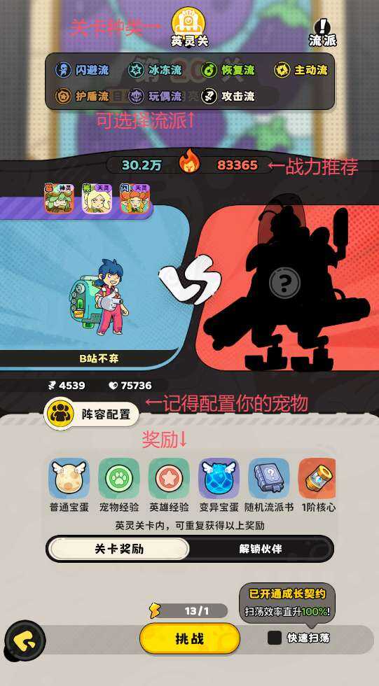 包含了关卡种类、流派选择、战力推荐、配置宠物、奖励预览、扫荡等。我们最关心的战力提升是根据你的英雄等级、宠物等级和配置宠物资质来决定的,前期只需要上阵最高资质的宠物旣妸。