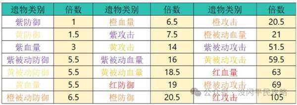 4、比如紫色防御升1级提升倍数为1的话,那么加成最高的红色遗物攻击升一级就是紫色防御的105倍(受本身属性百分比影响,每个(ge)号的倍数会有所差异,但是整体(zhengti)优先级不会变化)