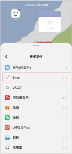 1、手(shou)机(ji)桌面长按或双指缩放弹出手(shou)机(ji)桌面插件管理(li)后台找(zhao)到(dao)Toxx相关插件