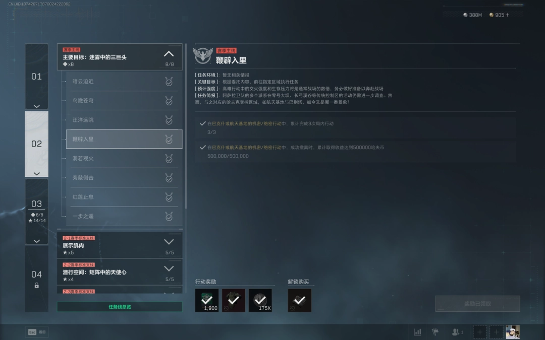 2、在巴克什或航天基(ji)地的机密/绝密行动中,成功(gong)撤离时,蔂計取(qu)得收益(income)达到(dao)500000哈夫币