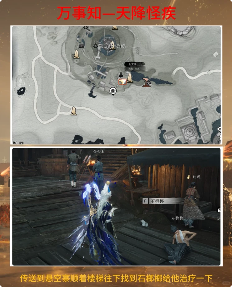 传送到悬空寨顺着楼梯往下找到(turn up)石榔榔给他治疗一(yi)下