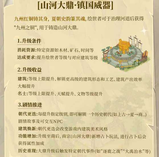 华夏绘世录山河大鼎升级教程九州红铜铸其身,夏朝史韵篆其魂,华夏绘世录山河大鼎升级教程绘世者可于治理河道后获得"九州之铜“,接下来就是具体内容。