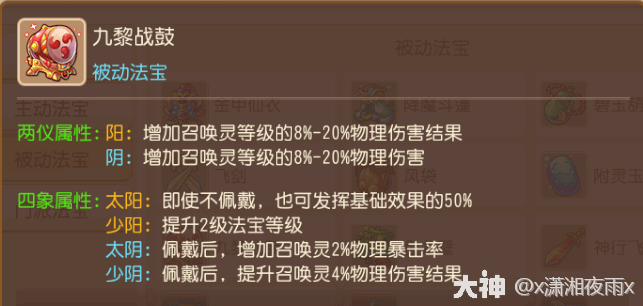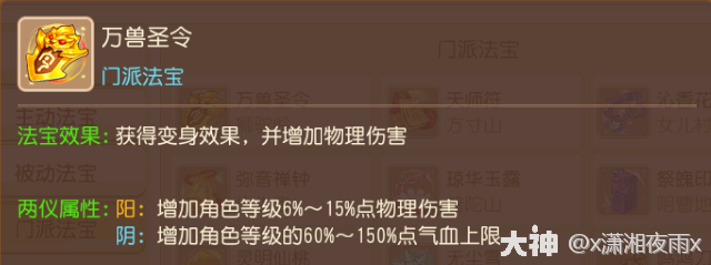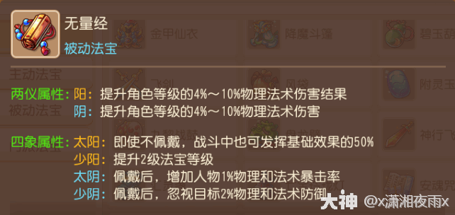 分析:门派法宝属于特(te)殊(shu)的主动法宝,但是两仪阳属性的物伤加成对于新(xin)手(shou)狮驼来说必不可少,所以不考虑使用后的效果如何,只取两仪的三条阳属性,增加自己的物伤面板