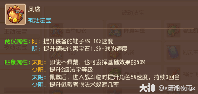 分析:狮驼必戴法宝之一,除了(Apart from)伤害以外,速度对于狮驼来说也很重要,而风袋提供的速度加成非常可观,太阴能够在进入战斗3回合内临时提升5%速度,而少阴能够增加法术躲(duo)避,对于新(xin)手(shou)来说洗到哪个就用哪个
